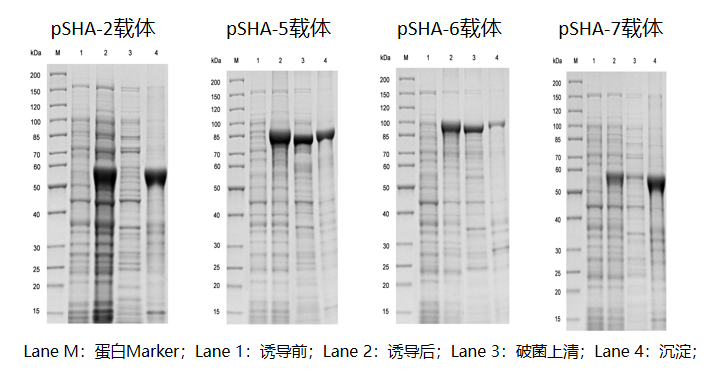案例2:对于难表达,表达低的蛋白,我们会采用不同载体和不同的促溶标签进行测试,最终成功表达并交付高活性蛋白。经由华安生物筛选改造的多个高表达载体,成功实现了目标蛋白在上清中的高效表达。