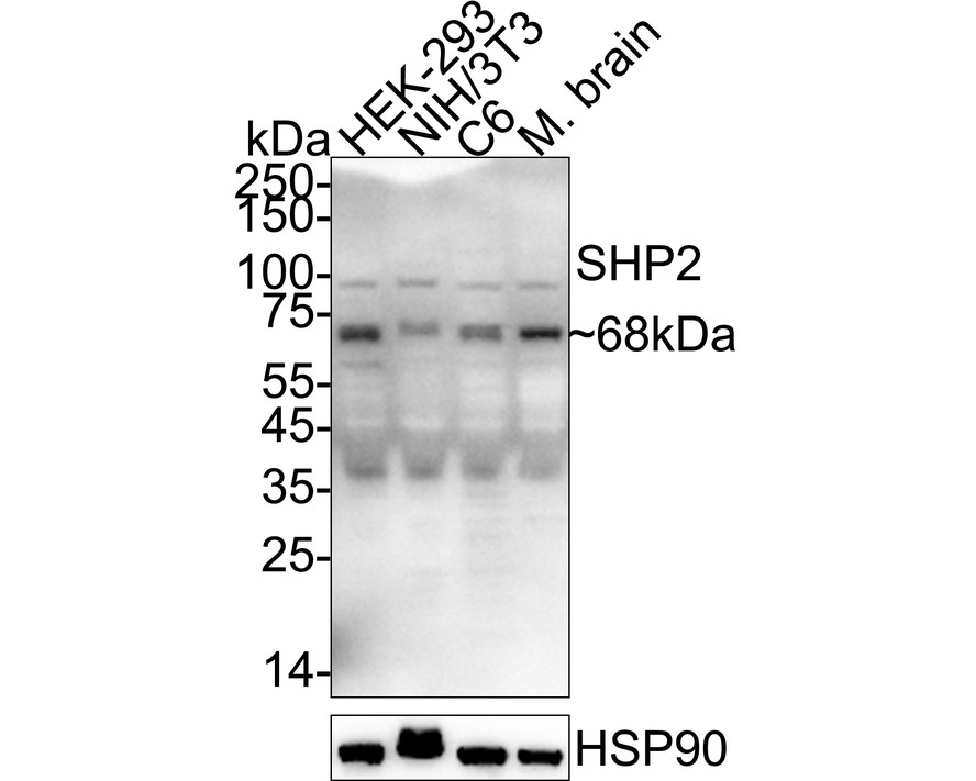 Western blot analysis of SHP2 on different lysates with Rabbit anti-SHP2 antibody (ET1611-35) at 1/2,000 dilution.
