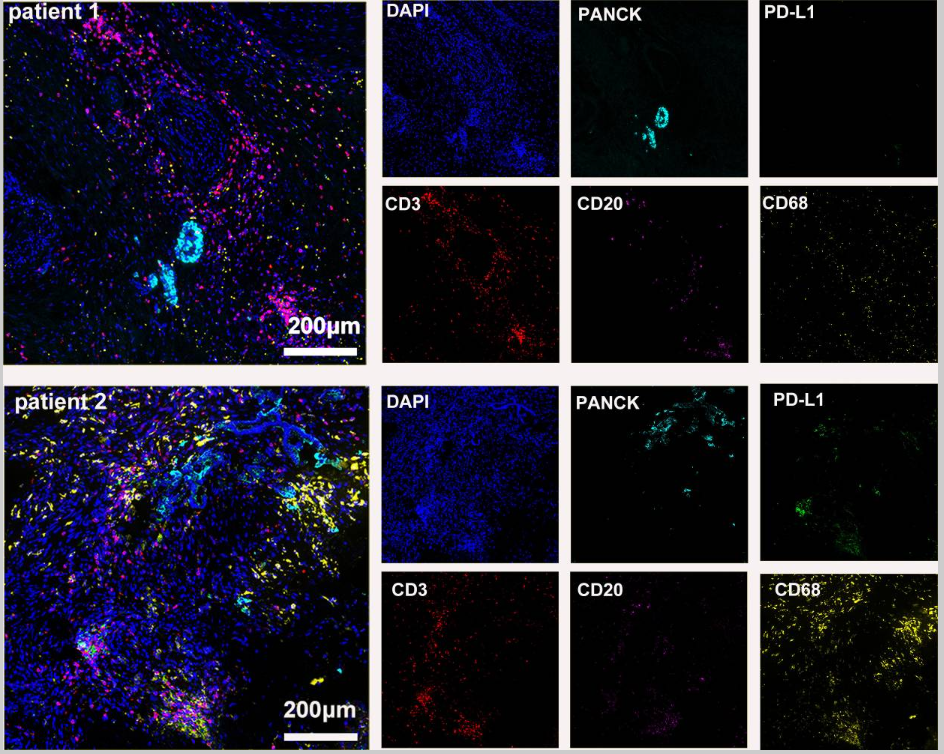 Fluorescence multiplex immunohistochemical analysis of the human non-small cell lung cancer (Formalin/PFA-fixed paraffin-embedded sections). Panel A: the merged image of anti-CD20 (HA721138, green), anti-CD68 (HA601115, gray), anti-PD-L1 (HA721176, cyan), anti-panCK (HA601138, magenta) and anti-CD3 (HA720082, yellow) on human non-small cell lung cancer. Panel B: anti- CD20 stained on B cells. Panel C: anti-CD68 stained on macrophage M1 and macrophage M2. Panel D: anti-PD-L1 stained on dendritic cells and macrophages cells. Panel E: anti-panCK stained on cancer cells. Panel F: anti-CD3 stained on T cells. HRP Conjugated UltraPolymer Goat Polyclonal Antibody HA1119/HA1120 was used as a secondary antibody. The immunostaining was performed with the Sequential Immuno-staining Kit (IRISKit™MH010101, www.luminiris.cn). The section was incubated in five rounds of staining: in the order of HA721138 (1/1,500 dilution), HA601115 (1/2,000 dilution), HA721176 (1/1,000 dilution), HA601138 (1/3,000 dilution), and HA720082 (1/500 dilution) for 20 mins at room temperature. Each round was followed by a separate fluorescent tyramide signal amplification system. Heat mediated antigen retrieval with Tris-EDTA buffer (pH 9.0) for 30 mins at 95℃. DAPI (blue) was used as a nuclear counter stain. Image acquisition was performed with Olympus VS200 Slide Scanner.