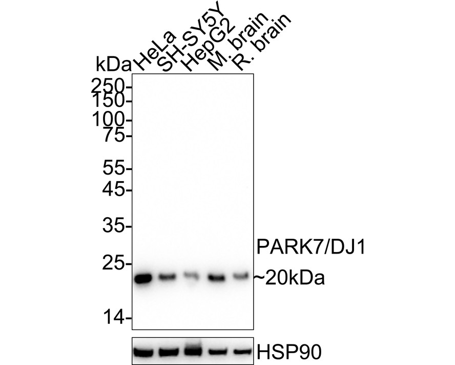 Western blot analysis of PARK7/DJ1 on different lysates with Rabbit anti-PARK7/DJ1 antibody (ET1611-45) at 1/1,000 dilution.
