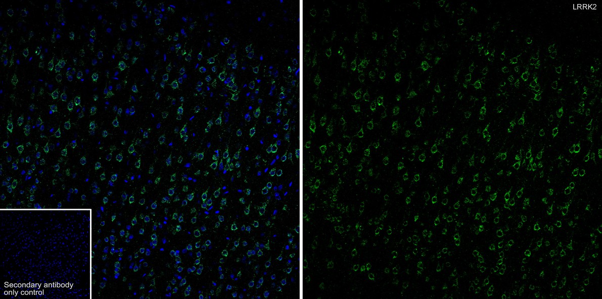 Immunofluorescence analysis of frozen rat brain tissue with Rabbit anti-LRRK2 antibody (HA722932) at 1/200 dilution.