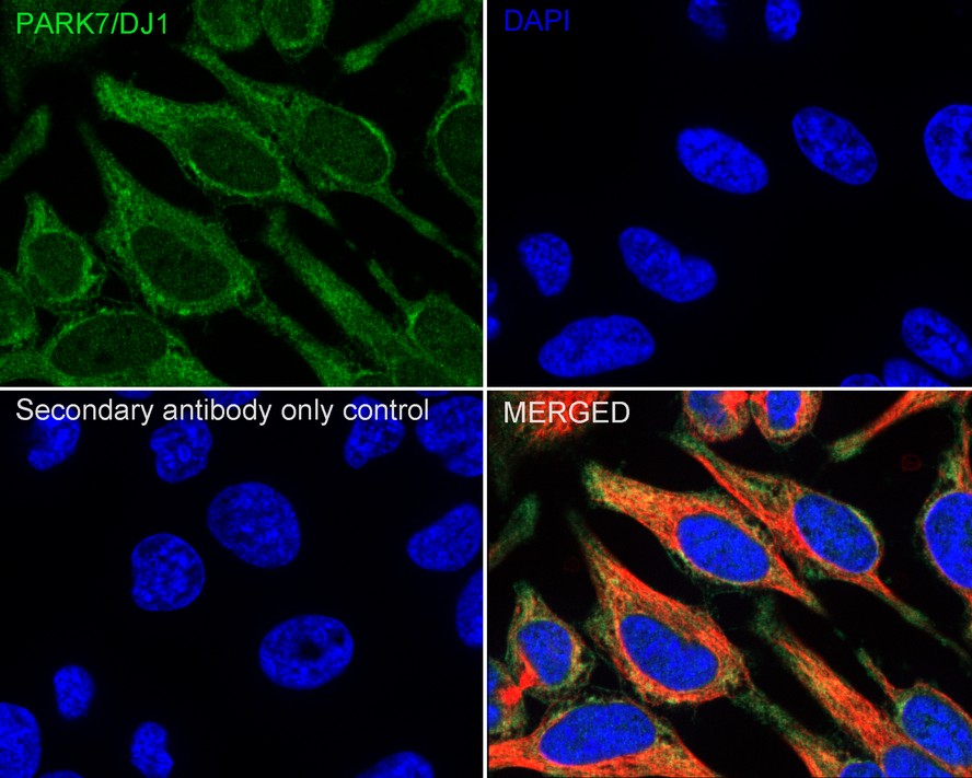 Cells were fixed in 100% precooled methanol for 5 minutes at room temperature, then blocked with 1% BSA in 10% negative goat serum for 1 hour at room temperature. Cells were then incubated with Rabbit anti-PARK7/DJ1 antibody (ET1611-45) at 1/100 dilution in 1% BSA in PBST overnight at 4 ℃. Goat Anti-Rabbit IgG H&L (iFluor™ 488, HA1121) was used as the secondary antibody at 1/1,000 dilution. PBS instead of the primary antibody was used as the secondary antibody only control. Nuclear DNA was labelled in blue with DAPI.