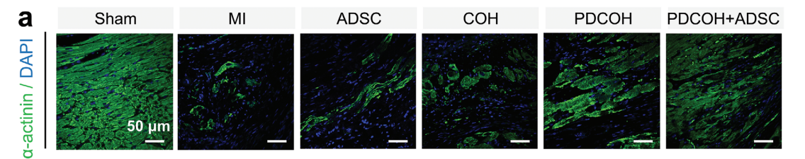 Cells were fixed in 4% paraformaldehyde for 30 minutes, permeabilized with 0.1% Triton X-100 in PBS for 15 minutes, and then blocked with 2% BSA for 30 minutes at room temperature. Cells were then incubated with Mouse anti-alpha Actinin antibody (EM1901-52) at 1/50 dilution in 2% BSA overnight at 4 ℃. Goat Anti-Mouse IgG H&L (iFluor™ 488, HA1125) was used as the secondary antibody at 1/1,000 dilution. PBS instead of the primary antibody was used as the secondary antibody only control. Nuclear DNA was labelled in blue with DAPI. -