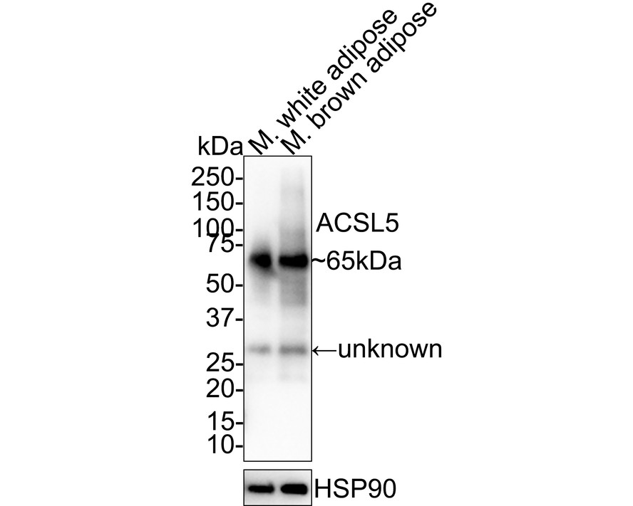 Western blot analysis of ACSL5 on different lysates with Mouse anti-ACSL5 antibody (HA610053) at 1/1,000 dilution.