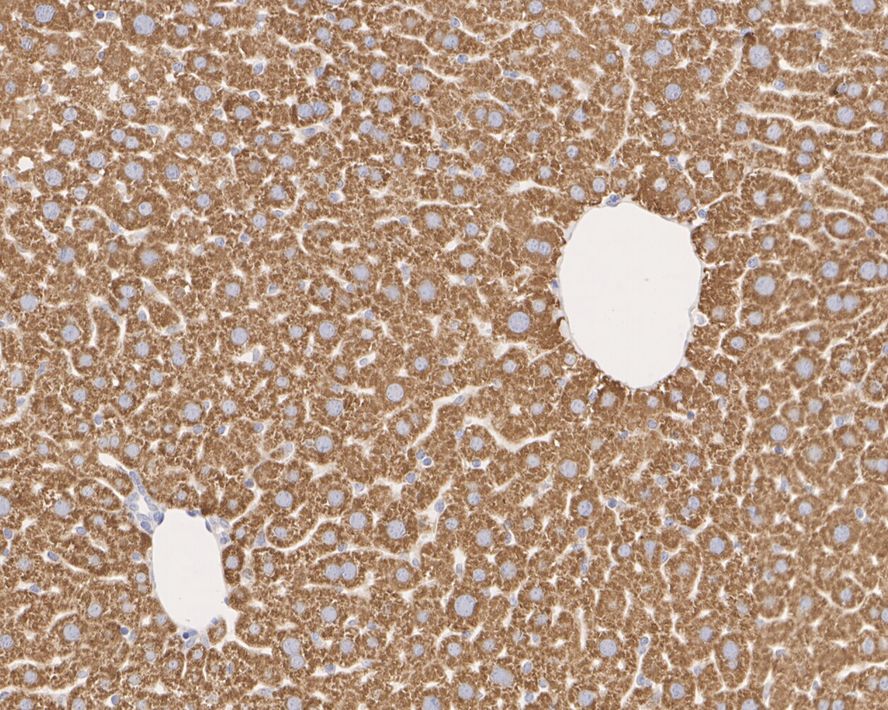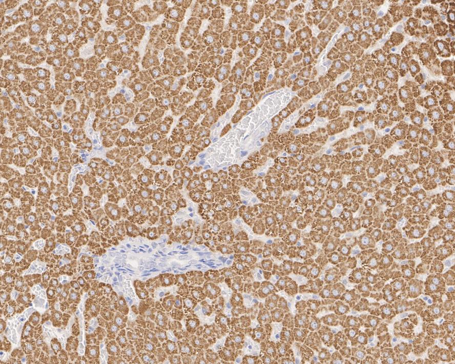 Immunohistochemical analysis of paraffin-embedded mouse liver tissue with Mouse anti-ACSL5 antibody (HA610053) at 1/1,000 dilution.
