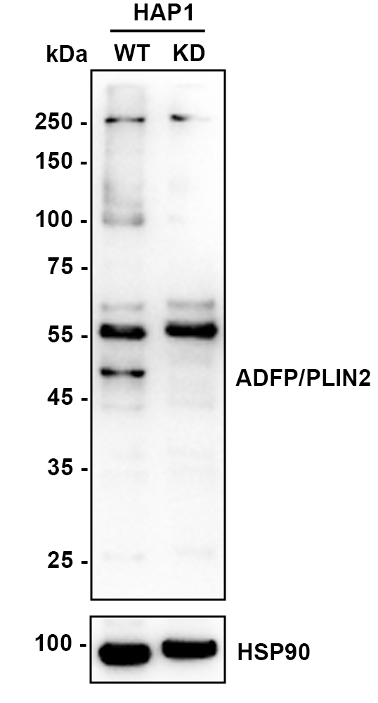 Lane 1: HAP1-parental cell lysate Lane 2: HAP1-ADFP / PLIN2 KD cell lysate