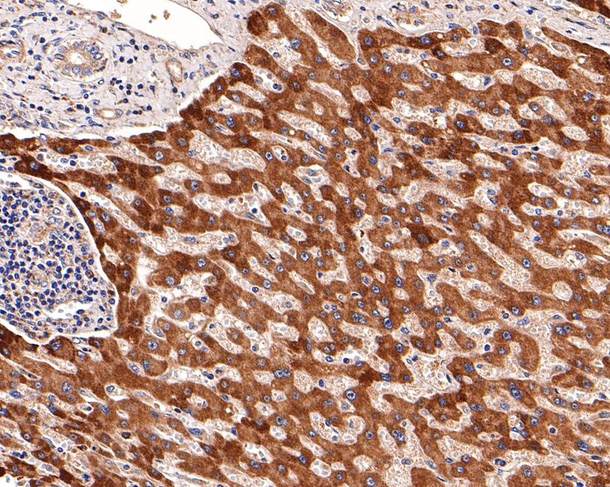 Immunohistochemical analysis of paraffin-embedded human liver tissue with Rabbit anti-ADFP / PLIN2 antibody (ET1704-17) at 1/100 dilution.