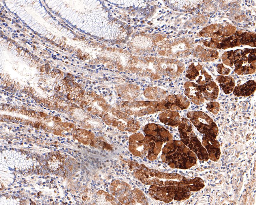 Immunohistochemical analysis of paraffin-embedded human stomach tissue with Rabbit anti-ADFP / PLIN2 antibody (ET1704-17) at 1/100 dilution.