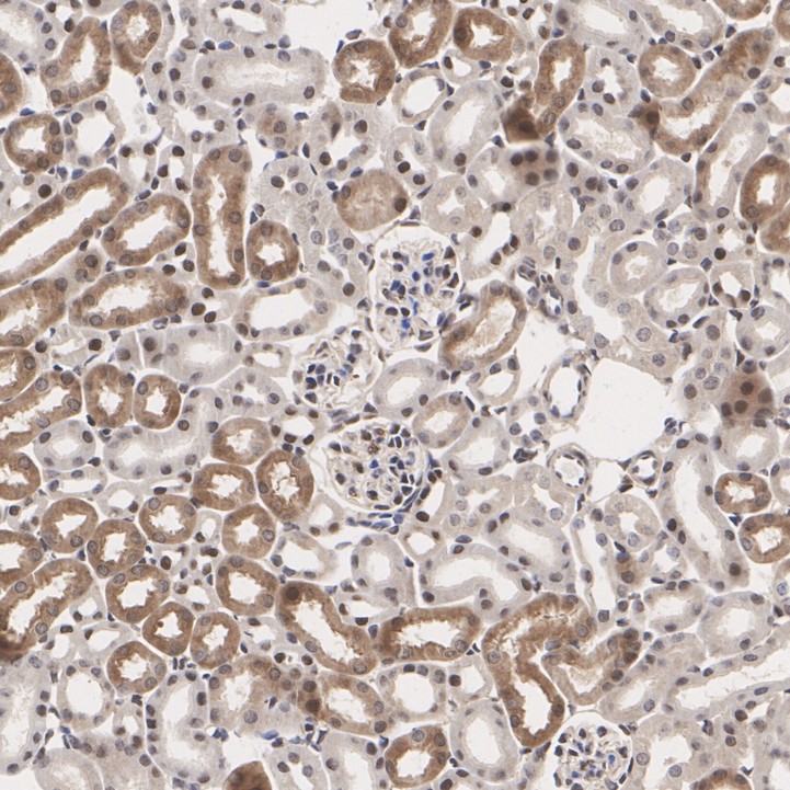 Immunohistochemical analysis of paraffin-embedded mouse kidney tissue with Rabbit anti-AKT1 antibody (HA750177) at 1/5,000 dilution.