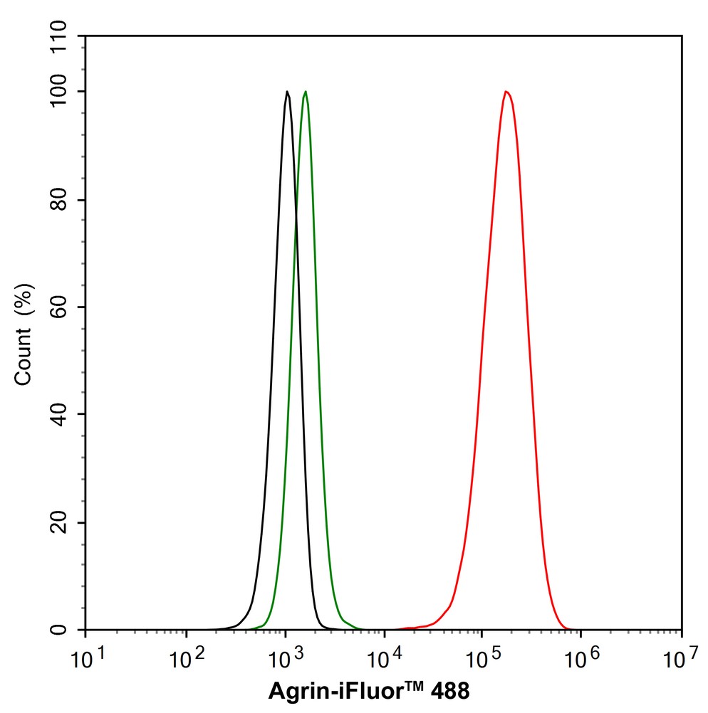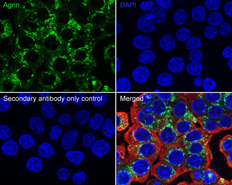 Cells were fixed in 4% paraformaldehyde for 15 minutes at room temperature, permeabilized with 0.1% Triton X-100 in PBS for 15 minutes at room temperature, then blocked with 1% BSA in 10% negative goat serum for 1 hour at room temperature. Cells were then incubated with Rabbit anti-Agrin antibody (HA724076) at 1/100 dilution in 1% BSA in PBST overnight at 4 ℃. Goat Anti-Rabbit IgG H&L (iFluor™ 488, HA1121) was used as the secondary antibody at 1/1,000 dilution. PBS instead of the primary antibody was used as the secondary antibody only control. Nuclear DNA was labelled in blue with DAPI.
