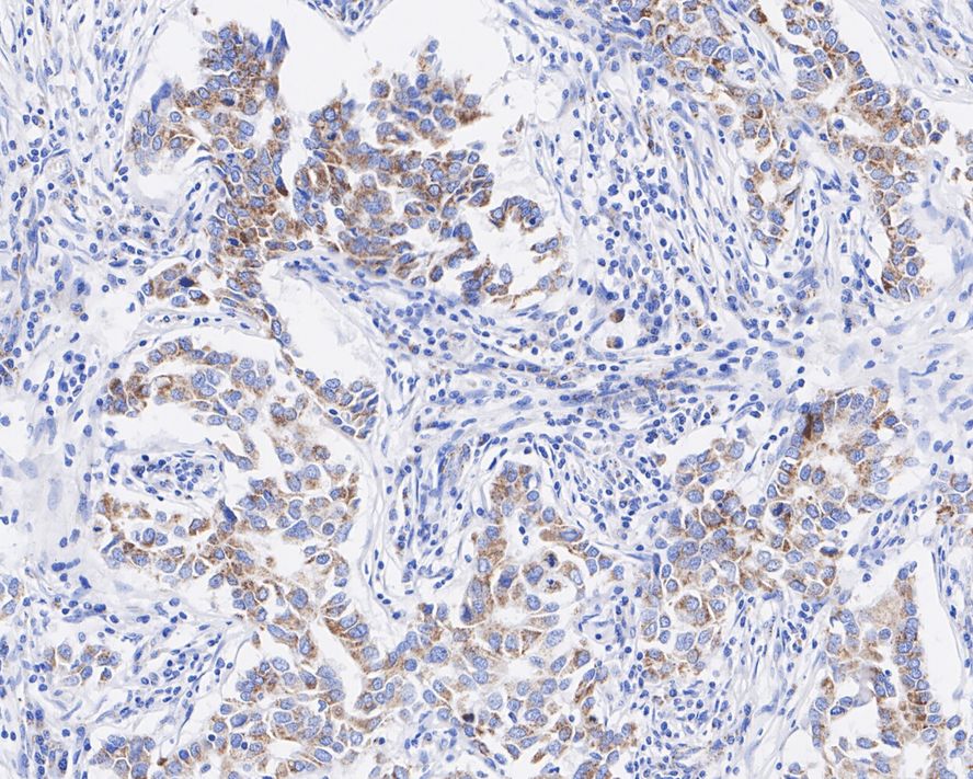 The section was pre-treated using heat mediated antigen retrieval with Tris-EDTA buffer (pH 9.0) for 20 minutes. The tissues were blocked in 1% BSA for 20 minutes at room temperature, washed with ddH2O and PBS, and then probed with the primary antibody (HA721953) at 1/2,000 dilution for 1 hour at room temperature. The detection was performed using an HRP conjugated compact polymer system. DAB was used as the chromogen. Tissues were counterstained with hematoxylin and mounted with DPX.