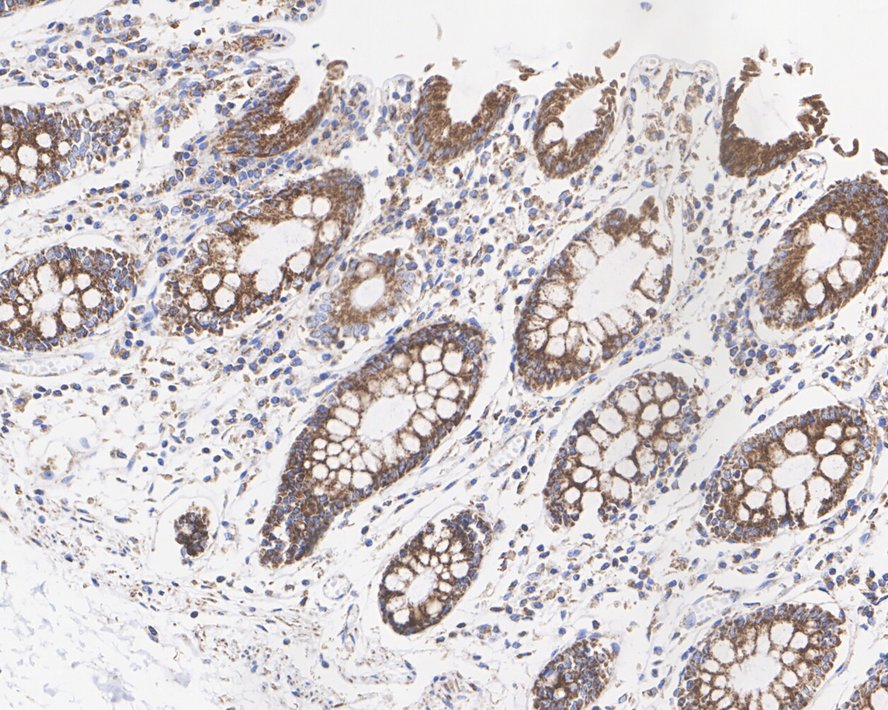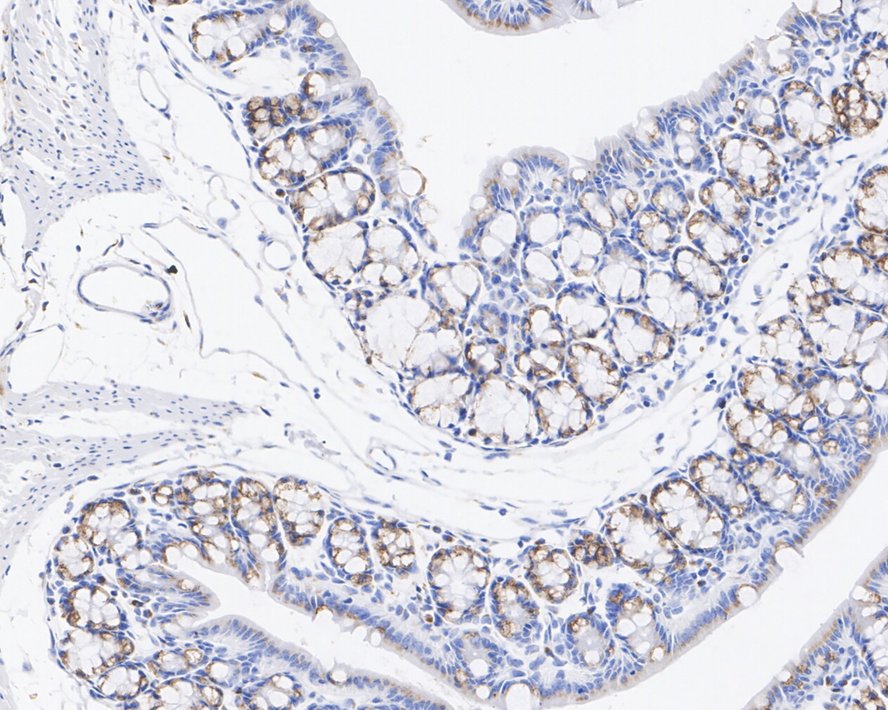 Immunohistochemical analysis of paraffin-embedded mouse colon tissue with Rabbit anti-BMP4 antibody (HA721953) at 1/1,000 dilution.
