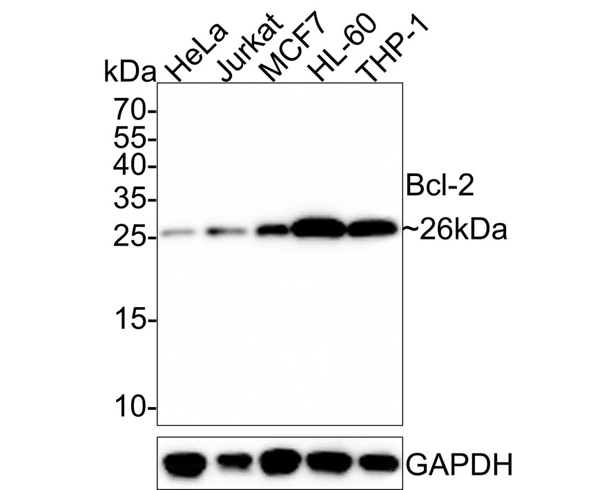 Western blot analysis of Bcl-2 on different lysates with Rabbit anti-Bcl-2 antibody (ET1702-53) at 1/5,000 dilution.