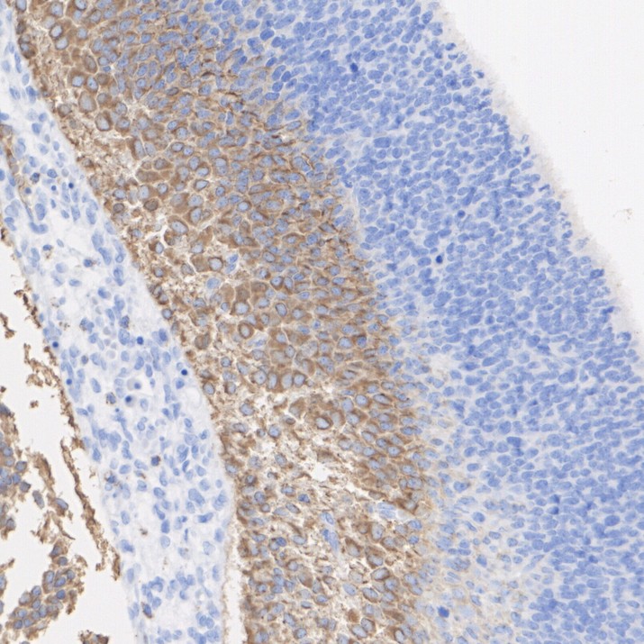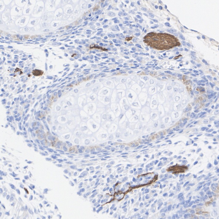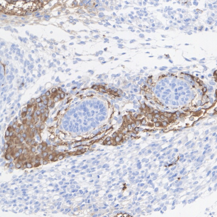 The section was pre-treated using heat mediated antigen retrieval with Tris-EDTA buffer (pH 9.0) for 20 minutes. The tissues were blocked in 1% BSA for 20 minutes at room temperature, washed with ddH2O and PBS, and then probed with the primary antibody (HA751554) at 1/4,000 dilution for 1 hour at room temperature. The detection was performed using an HRP conjugated compact polymer system. DAB was used as the chromogen. Tissues were counterstained with hematoxylin and mounted with DPX. -