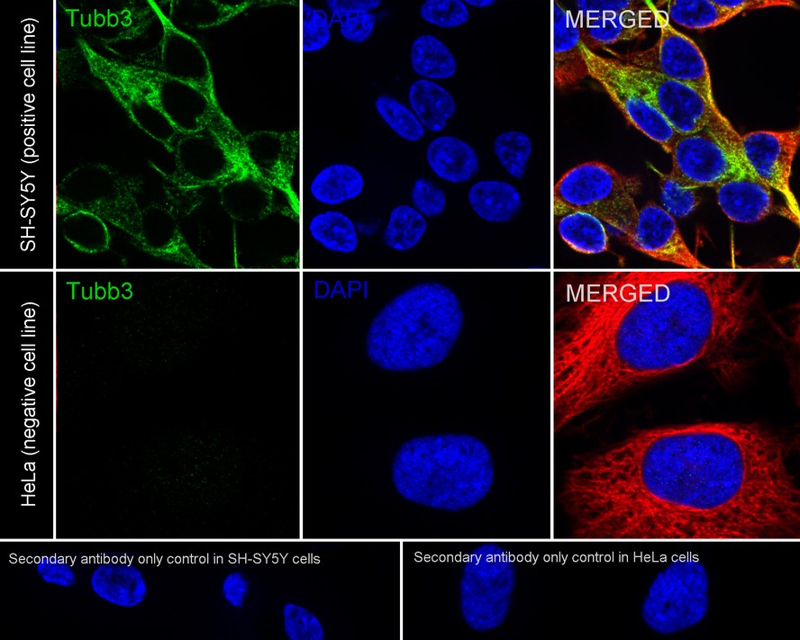 Immunocytochemistry analysis of SH-SY5Y (positive) and HeLa (negative) labeling Beta III Tubulin with Rabbit anti-Beta III Tubulin antibody (HA751554) at 1/500 dilution.
