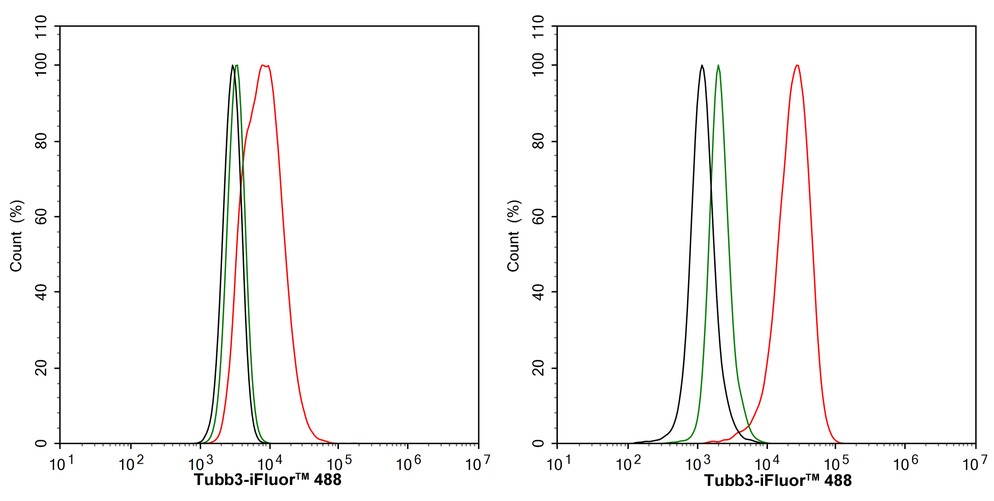 Flow cytometric analysis of HeLa (left, negative) and SH-SY5Y (right, positive) cells labeling Beta III Tubulin.