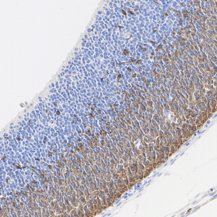 Immunohistochemical analysis of paraffin-embedded mouse cerebellum tissue with Rabbit anti-Beta III Tubulin antibody (HA751554) at 1/4,000 dilution.
