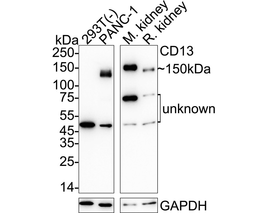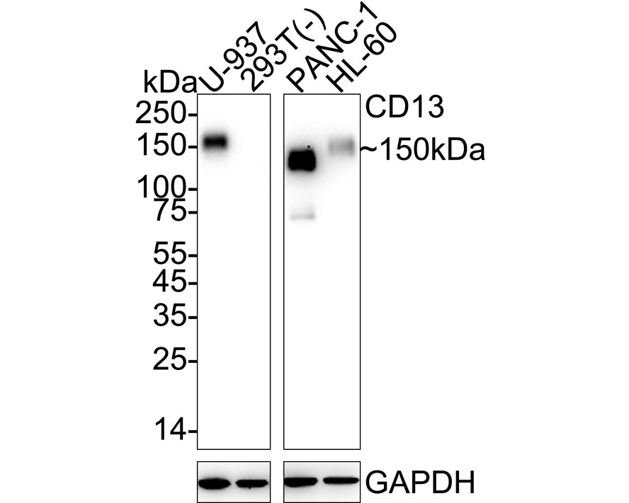Western blot analysis of CD13 on different lysates with Rabbit anti-CD13 antibody (ET1611-61) at 1/2,000 dilution.