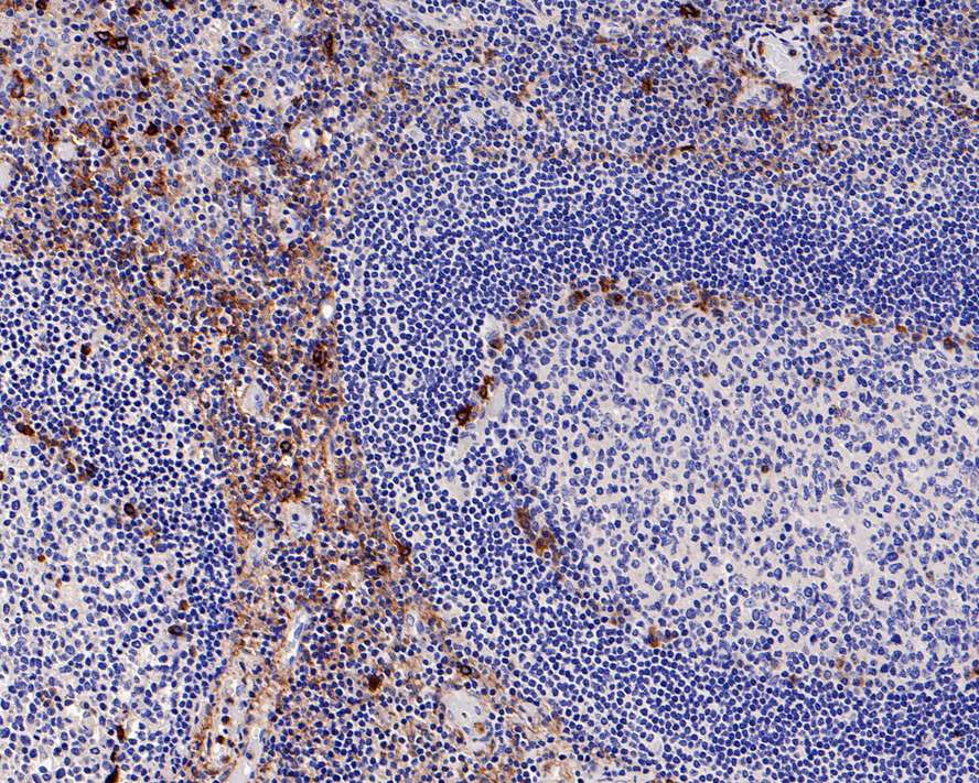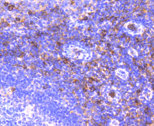 Immunohistochemical analysis of paraffin-embedded human tonsil tissue using anti-CD13 antibody. The section was pre-treated using heat mediated antigen retrieval with Tris-EDTA buffer (pH 8.0-8.4) for 20 minutes.The tissues were blocked in 5% BSA for 30 minutes at room temperature, washed with ddH2O and PBS, and then probed with the primary antibody (ET1611-61, 1/50) for 30 minutes at room temperature. The detection was performed using an HRP conjugated compact polymer system. DAB was used as the chromogen. Tissues were counterstained with hematoxylin and mounted with DPX.