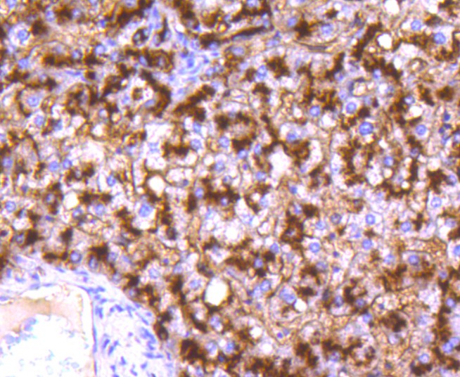 Immunohistochemical analysis of paraffin-embedded human liver tissue using anti-CD13 antibody. The section was pre-treated using heat mediated antigen retrieval with Tris-EDTA buffer (pH 8.0-8.4) for 20 minutes.The tissues were blocked in 5% BSA for 30 minutes at room temperature, washed with ddH2O and PBS, and then probed with the primary antibody (ET1611-61, 1/50) for 30 minutes at room temperature. The detection was performed using an HRP conjugated compact polymer system. DAB was used as the chromogen. Tissues were counterstained with hematoxylin and mounted with DPX.