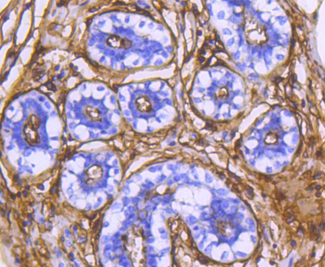 Immunohistochemical analysis of paraffin-embedded human breast tissue using anti-CD13 antibody. The section was pre-treated using heat mediated antigen retrieval with Tris-EDTA buffer (pH 8.0-8.4) for 20 minutes.The tissues were blocked in 5% BSA for 30 minutes at room temperature, washed with ddH2O and PBS, and then probed with the primary antibody (ET1611-61, 1/50) for 30 minutes at room temperature. The detection was performed using an HRP conjugated compact polymer system. DAB was used as the chromogen. Tissues were counterstained with hematoxylin and mounted with DPX.
