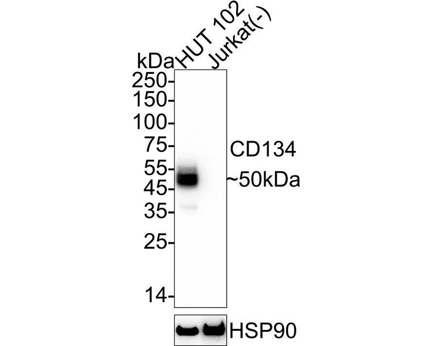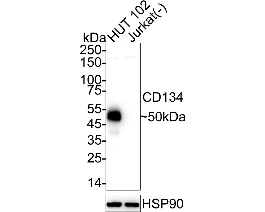 Western blot analysis of CD134 on different lysates with Rabbit anti-CD134 antibody (HA751343) at 1/2,000 dilution.