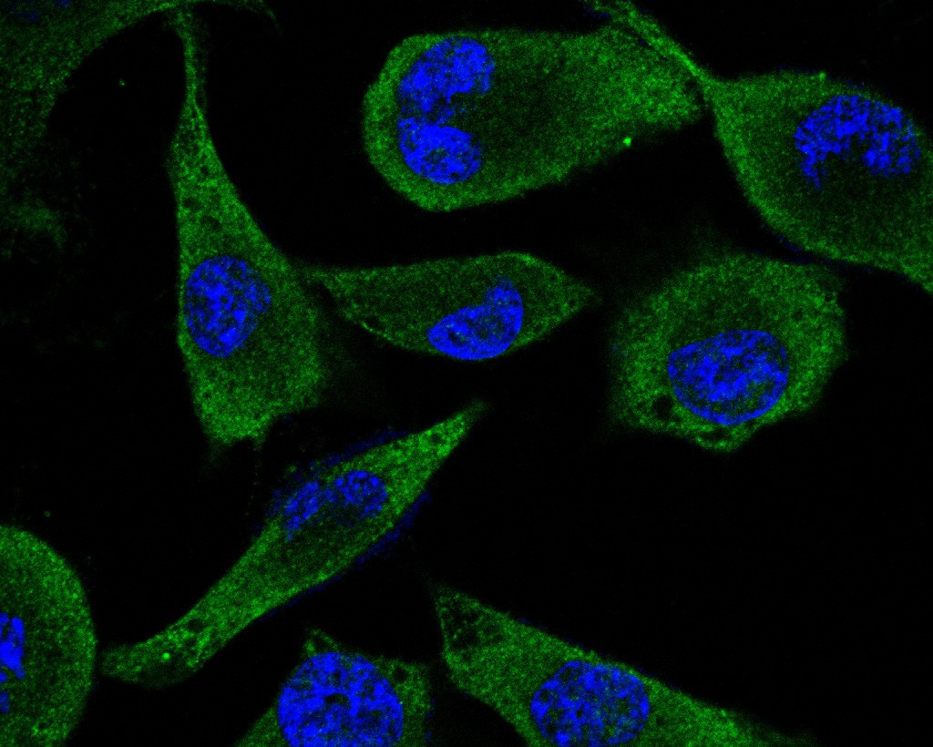 ICC staining of CD166 in A549 cells (green). Formalin fixed cells were permeabilized with 0.1% Triton X-100 in TBS for 10 minutes at room temperature and blocked with 10% negative goat serum for 15 minutes at room temperature. Cells were probed with the primary antibody (HA600083, 1/100) for 1 hour at room temperature, washed with PBS. Alexa Fluor®488 conjugate-Goat anti-Mouse IgG was used as the secondary antibody at 1/1,000 dilution. The nuclear counter stain is DAPI (blue).