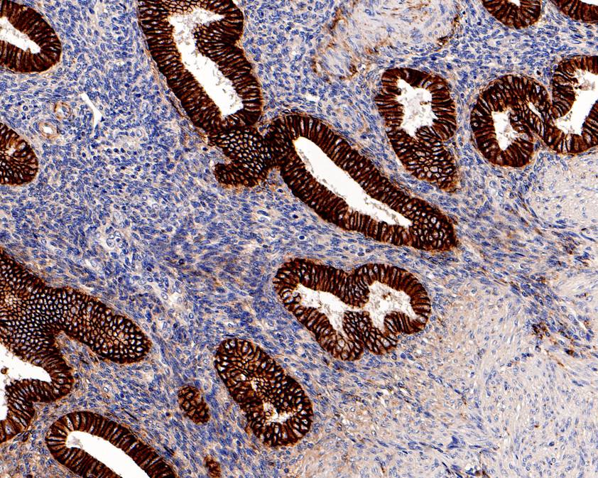 Immunohistochemical analysis of paraffin-embedded human endometrium tissue using anti-CD166 antibody. The section was pre-treated using heat mediated antigen retrieval with Tris-EDTA buffer (pH 9.0) for 20 minutes.The tissues were blocked in 1% BSA for 30 minutes at room temperature, washed with ddH2O and PBS, and then probed with the primary antibody (HA600083, 1/1,500) for 30 minutes at room temperature. The detection was performed using an HRP conjugated compact polymer system. DAB was used as the chromogen. Tissues were counterstained with hematoxylin and mounted with DPX.