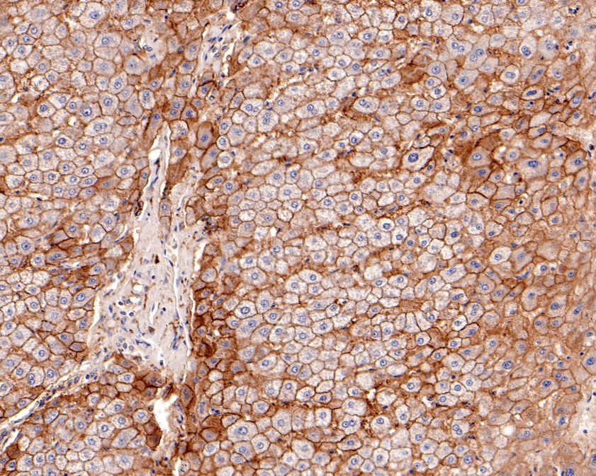 Immunohistochemical analysis of paraffin-embedded human liver tissue using anti-CD166 antibody. The section was pre-treated using heat mediated antigen retrieval with Tris-EDTA buffer (pH 9.0) for 20 minutes.The tissues were blocked in 1% BSA for 30 minutes at room temperature, washed with ddH2O and PBS, and then probed with the primary antibody (HA600083, 1/1,500) for 30 minutes at room temperature. The detection was performed using an HRP conjugated compact polymer system. DAB was used as the chromogen. Tissues were counterstained with hematoxylin and mounted with DPX.