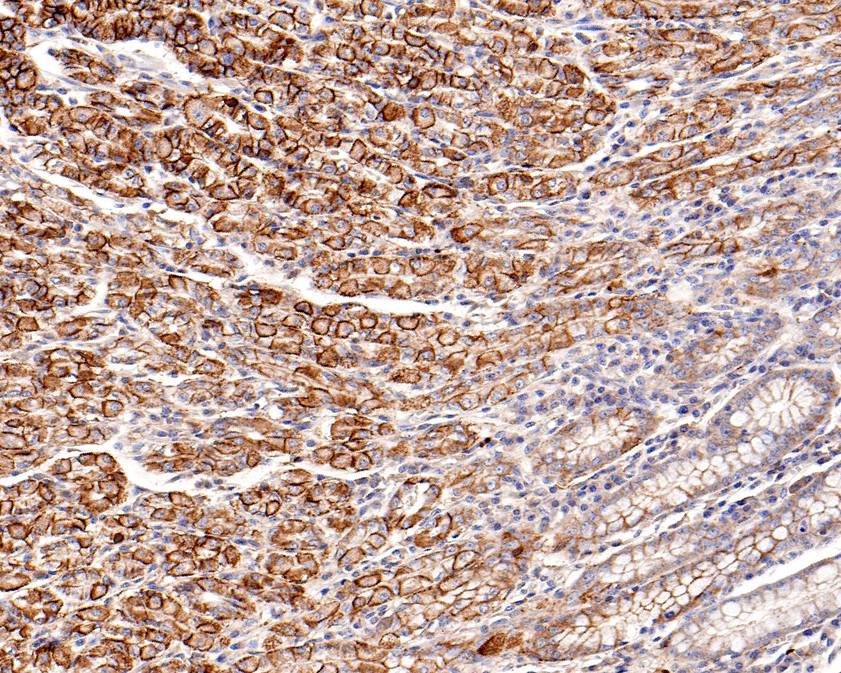 Immunohistochemical analysis of paraffin-embedded human stomach tissue using anti-CD166 antibody. The section was pre-treated using heat mediated antigen retrieval with Tris-EDTA buffer (pH 9.0) for 20 minutes.The tissues were blocked in 1% BSA for 30 minutes at room temperature, washed with ddH2O and PBS, and then probed with the primary antibody (HA600083, 1/800) for 30 minutes at room temperature. The detection was performed using an HRP conjugated compact polymer system. DAB was used as the chromogen. Tissues were counterstained with hematoxylin and mounted with DPX.