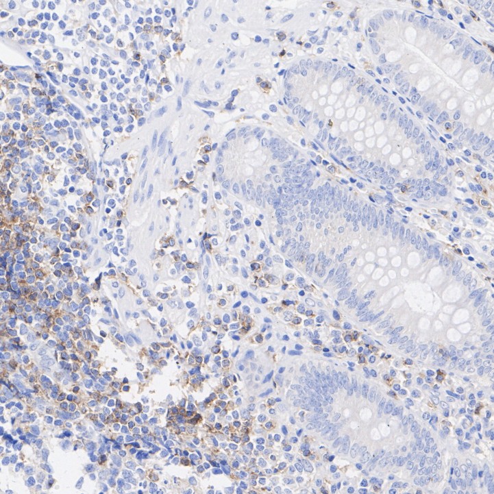 Immunohistochemical analysis of paraffin-embedded human appendix tissue with Rabbit anti-CD2 antibody (HA722484) at 1/200 dilution.