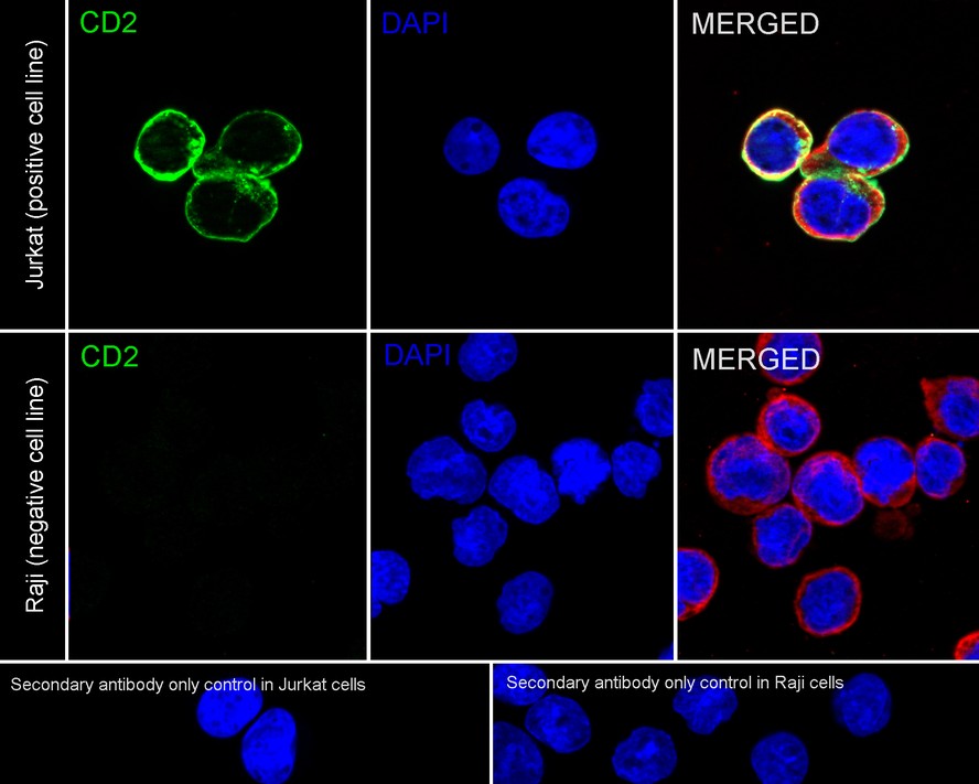 Immunocytochemistry analysis of Jurkat (positive) and Raji (negative) labeling CD2 with Rabbit anti-CD2 antibody (HA722484) at 1/100 dilution.