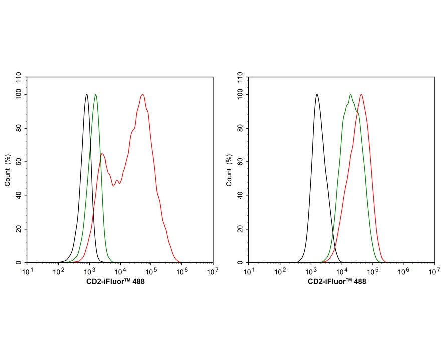 Flow cytometric analysis of Jurkat (left, positive) and Raji (right, negative) cells labeling CD2.