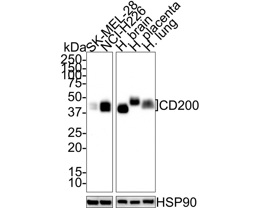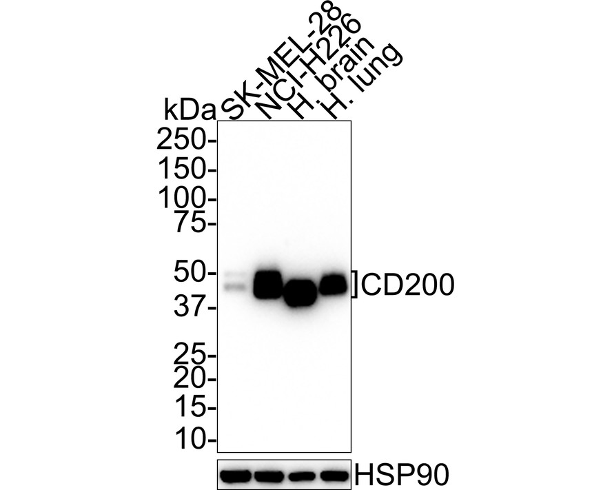 Western blot analysis of CD200 on different lysates with Rabbit anti-CD200 antibody (HA721691) at 1/1,000 dilution.