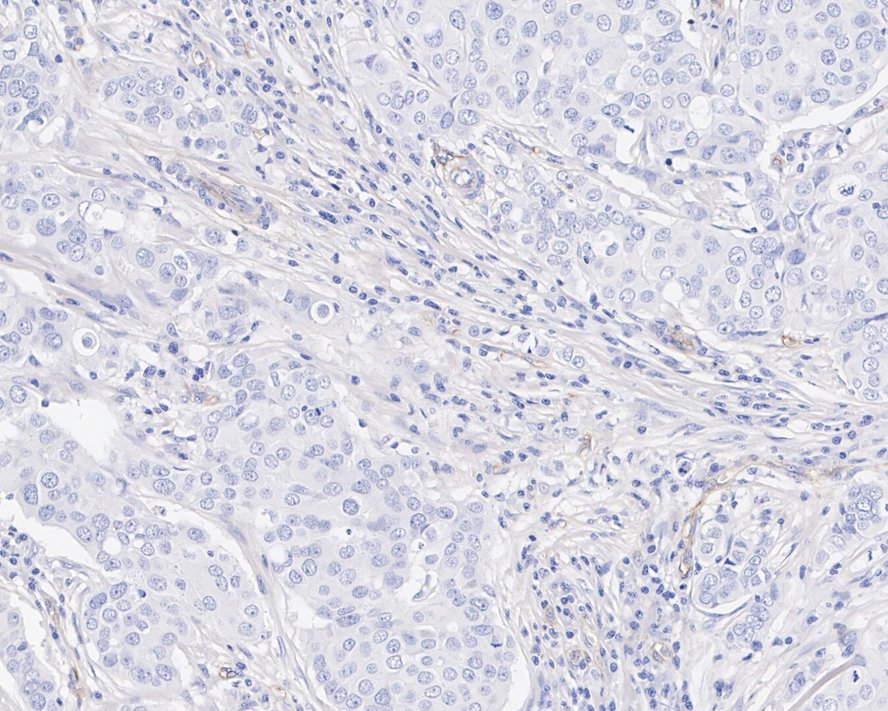 Immunohistochemical analysis of paraffin-embedded human breast carcinoma tissue (negative control) with Rabbit anti-CD200 antibody (HA721691) at 1/800 dilution.
