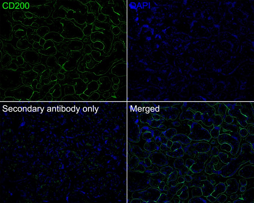 Immunofluorescence analysis of paraffin-embedded human placenta tissue labeling CD200 with Rabbit anti-CD200 antibody (HA721691) at 1/200 dilution.