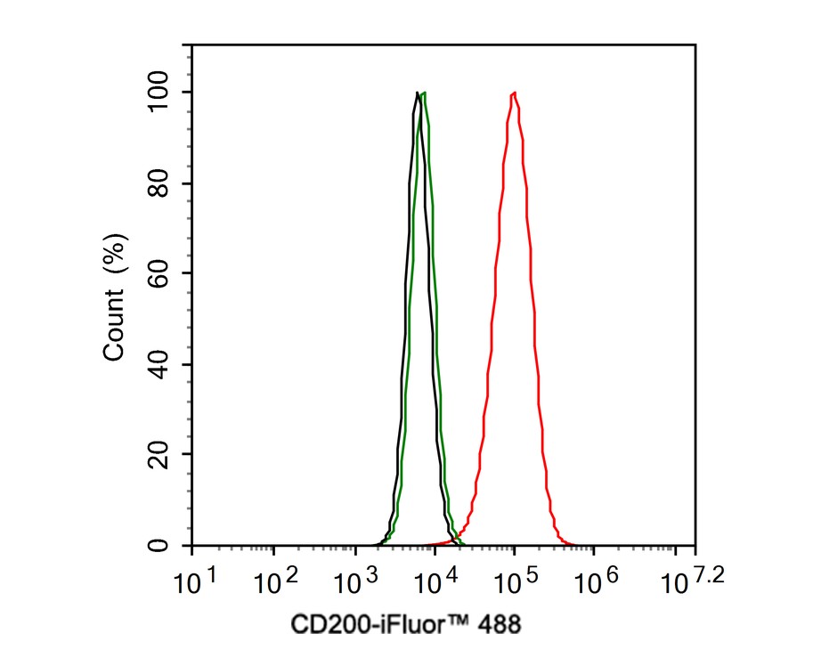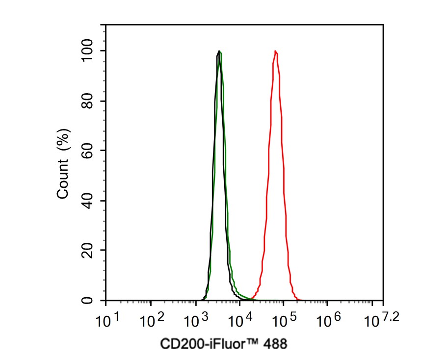 Cells were washed twice with cold PBS and resuspend. Then stained with the primary antibody (HA721691, 1ug/ml) (red) compared with Rabbit IgG Isotype Control (green). After incubation of the primary antibody at +4℃ for an hour, the cells were stained with a iFluor™ 488 conjugate-Goat anti-Rabbit IgG Secondary antibody (HA1121) at 1/1,000 dilution for 30 minutes at +4℃. Unlabelled sample was used as a control (cells without incubation with primary antibody; black).
