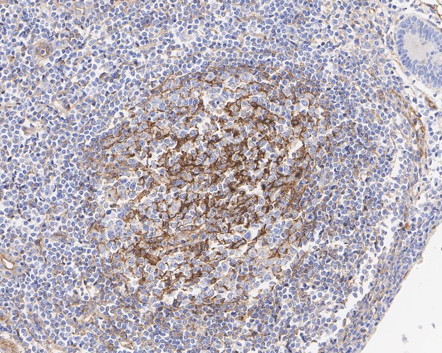 Immunohistochemical analysis of paraffin-embedded human lymph node tissue with Rabbit anti-CD200 antibody (HA721692) at 1/2,000 dilution.
