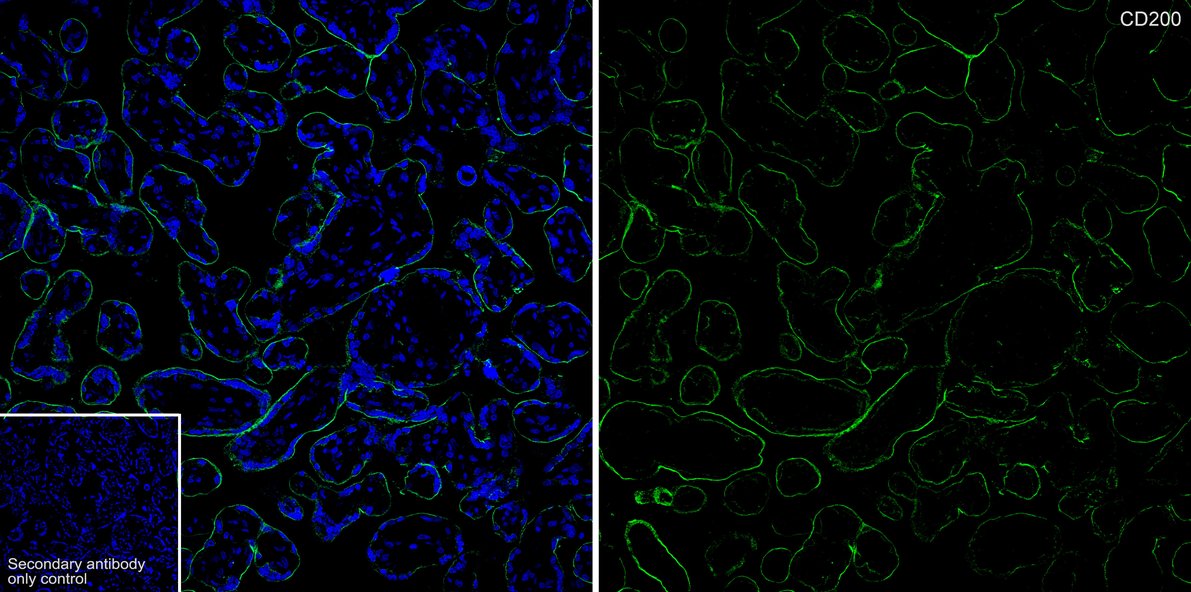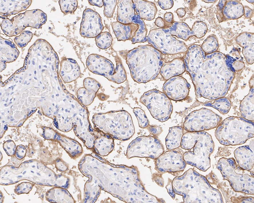 Immunohistochemical analysis of paraffin-embedded human placenta tissue with Rabbit anti-CD200 antibody (HA721692) at 1/2,000 dilution.