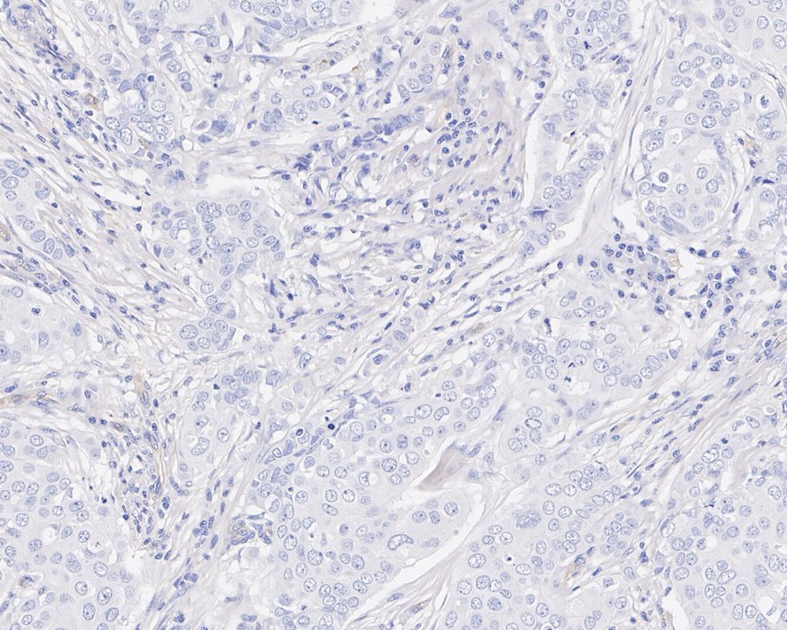 Immunohistochemical analysis of paraffin-embedded human breast carcinoma tissue (negative control) with Rabbit anti-CD200 antibody (HA721692) at 1/800 dilution.