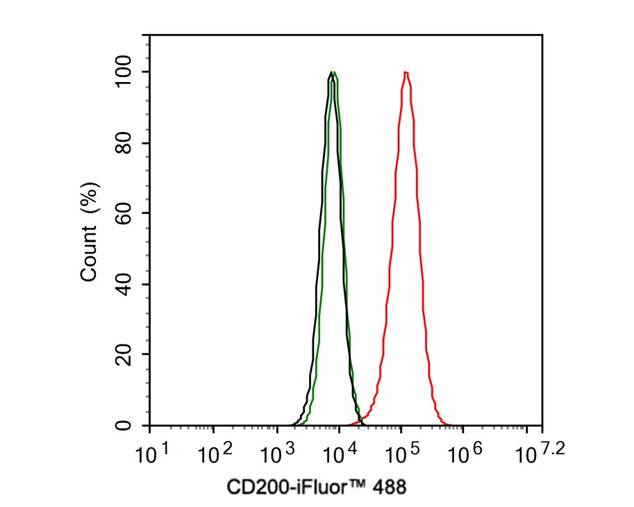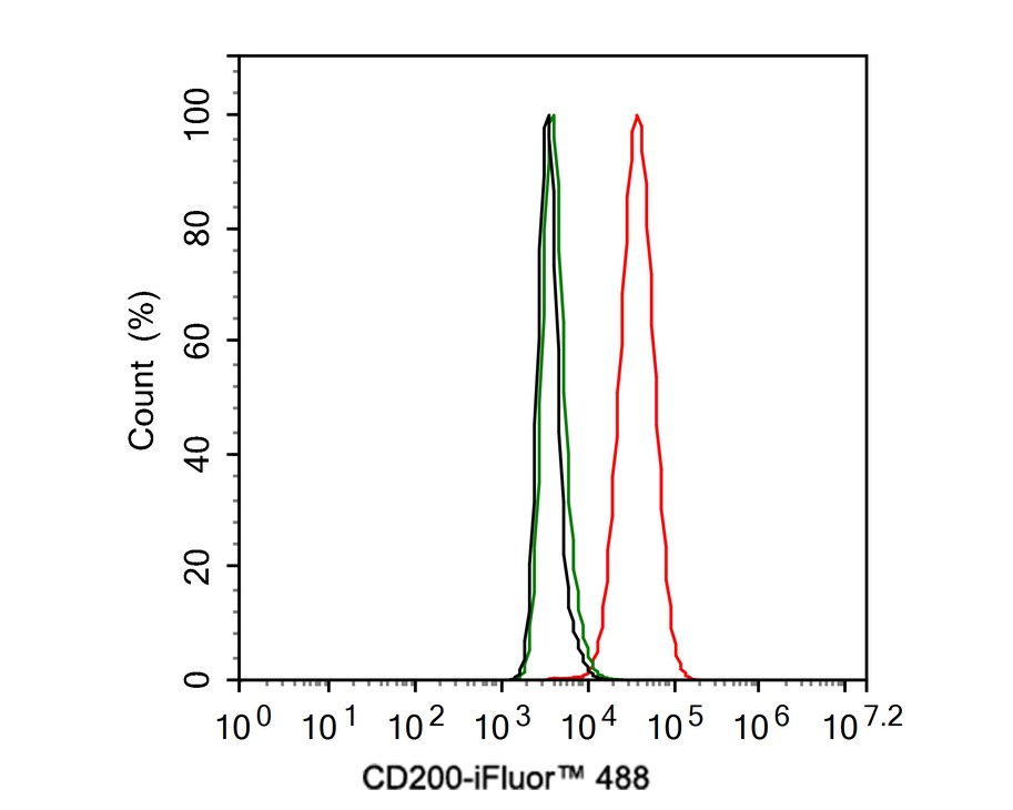 Cells were washed twice with cold PBS and resuspend. Then stained with the primary antibody (HA721692, 1ug/ml) (red) compared with Rabbit IgG Isotype Control (green). After incubation of the primary antibody at +4℃ for an hour, the cells were stained with a iFluor™ 488 conjugate-Goat anti-Rabbit IgG Secondary antibody (HA1121) at 1/1,000 dilution for 30 minutes at +4℃. Unlabelled sample was used as a control (cells without incubation with primary antibody; black).