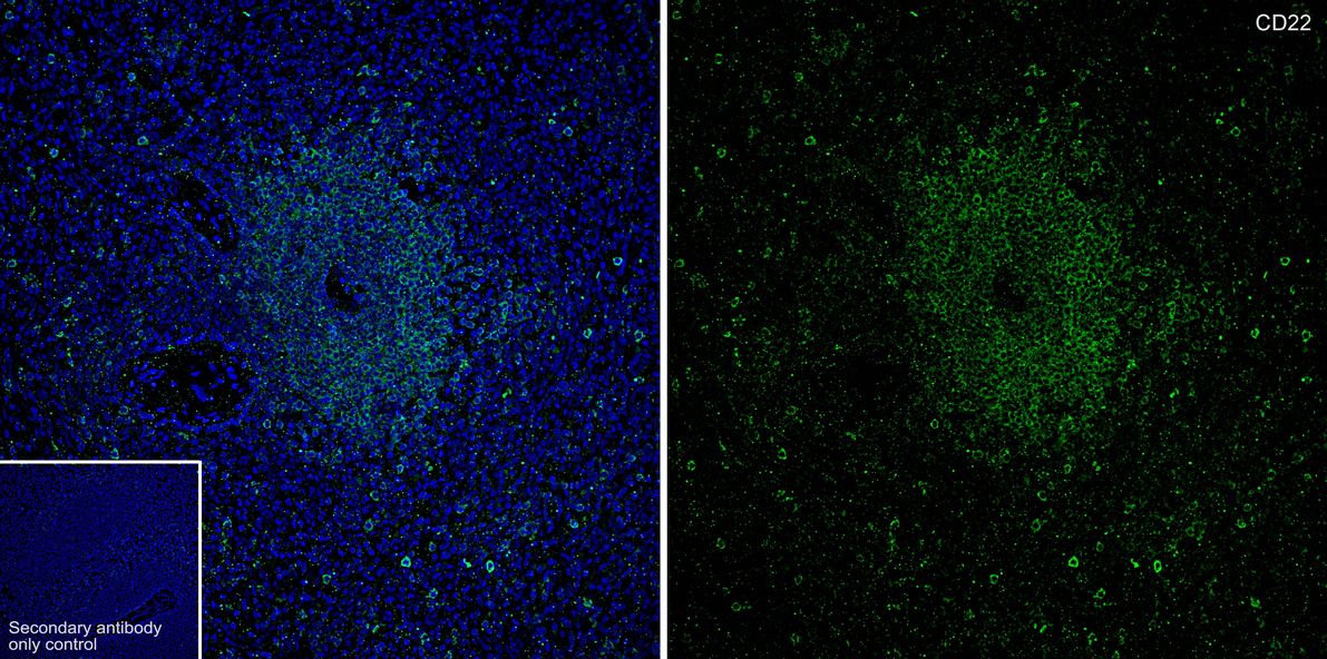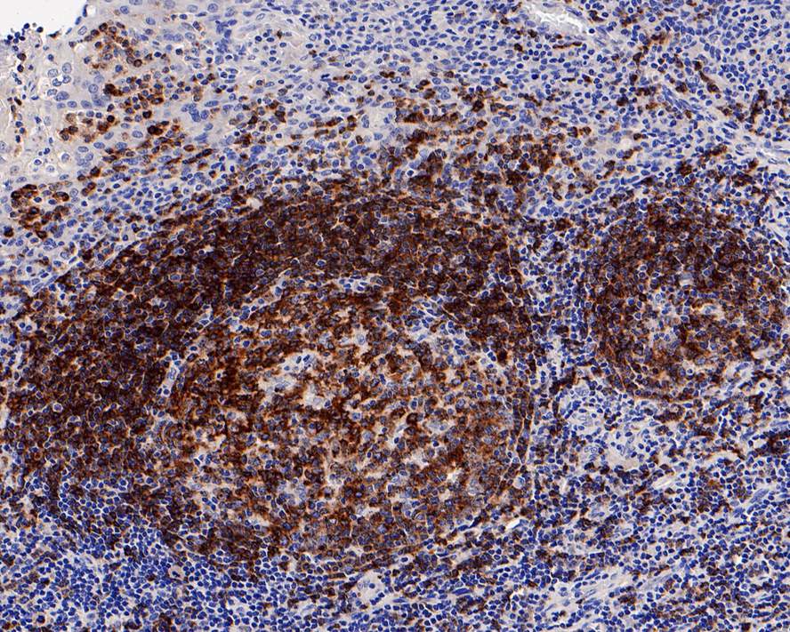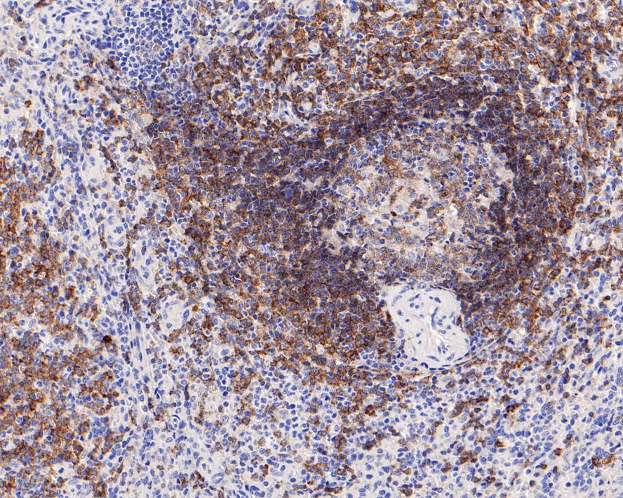 Immunohistochemical analysis of paraffin-embedded human spleen tissue with Rabbit anti-CD22 antibody (HA721157) at 1/1,000 dilution.