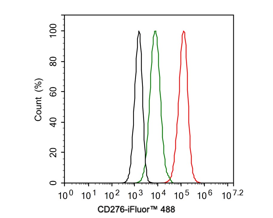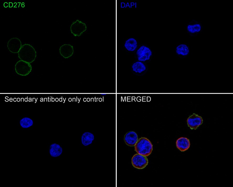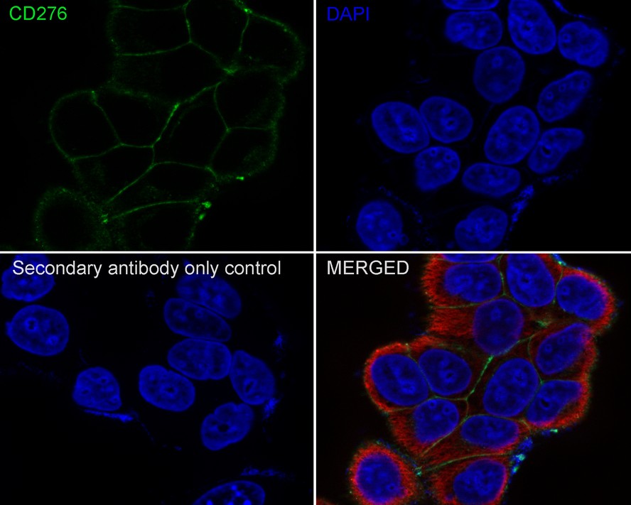 Cells were fixed in 100% precooled methanol for 5 minutes at room temperature, then blocked with 1% BSA in 10% negative goat serum for 1 hour at room temperature. Cells were then incubated with Rabbit anti-CD276 antibody (HA750811) at 1/100 dilution in 1% BSA in PBST overnight at 4 ℃. Goat Anti-Rabbit IgG H&L (iFluor™ 488, HA1121) was used as the secondary antibody at 1/1,000 dilution. PBS instead of the primary antibody was used as the secondary antibody only control. Nuclear DNA was labelled in blue with DAPI.