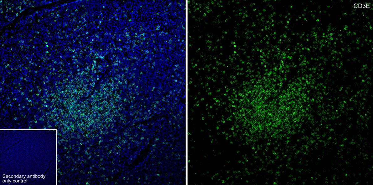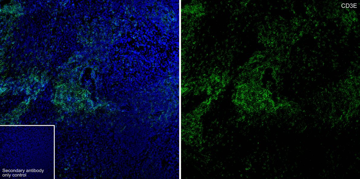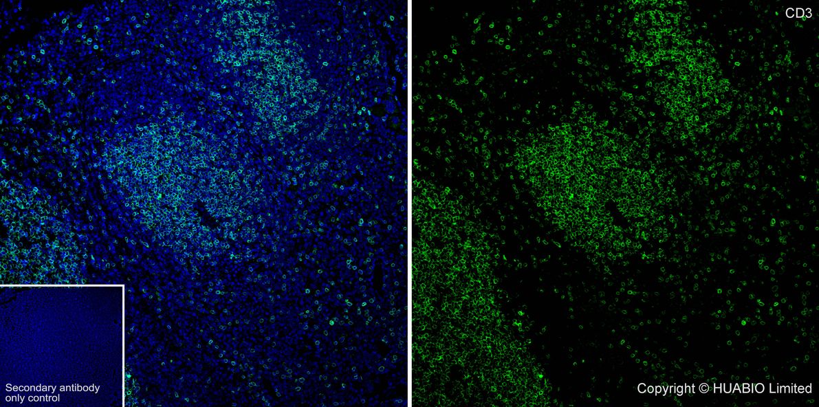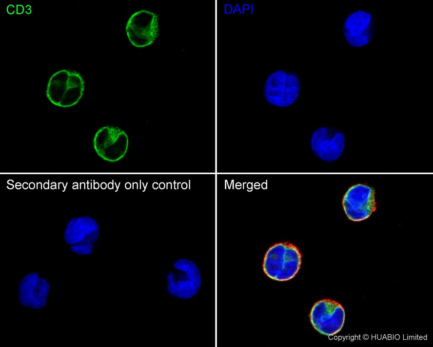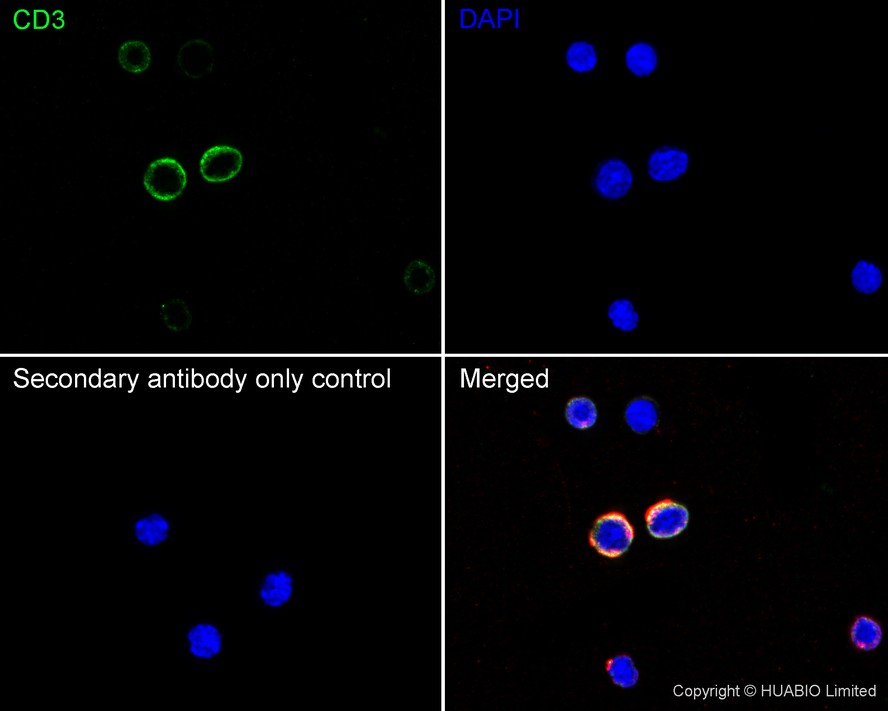 Cells were fixed in 4% paraformaldehyde for 15 minutes at room temperature, permeabilized with 0.1% Triton X-100 in PBS for 15 minutes at room temperature, then blocked with 1% BSA in 10% negative goat serum for 1 hour at room temperature. Cells were then incubated with Rabbit anti-CD3 antibody (HA724302) at 1/2,500 dilution in 1% BSA in PBST overnight at 4 ℃. Goat Anti-Rabbit IgG H&L (iFluor™ 488, HA1121) was used as the secondary antibody at 1/1,000 dilution. PBS instead of the primary antibody was used as the secondary antibody only control. Nuclear DNA was labelled in blue with DAPI.