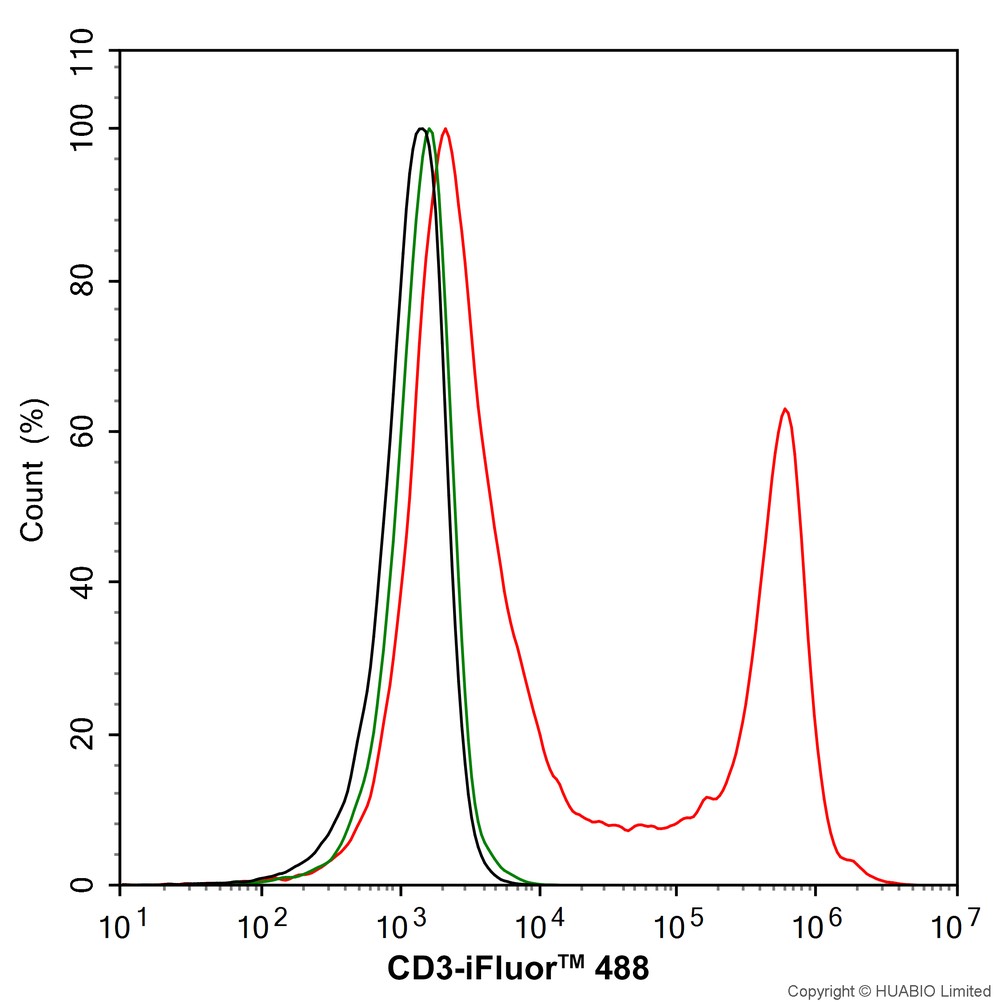 Cells were fixed in 4% paraformaldehyde for 15 minutes at room temperature, permeabilized with 0.1% Triton X-100 in PBS for 15 minutes at room temperature, then blocked with 1% BSA in 10% negative goat serum for 1 hour at room temperature. Cells were then incubated with Rabbit anti-CD3 antibody (HA724302) at 1/200 dilution in 1% BSA in PBST overnight at 4 ℃. Goat Anti-Rabbit IgG H&L (iFluor™ 488, HA1121) was used as the secondary antibody at 1/1,000 dilution. PBS instead of the primary antibody was used as the secondary antibody only control. Nuclear DNA was labelled in blue with DAPI.