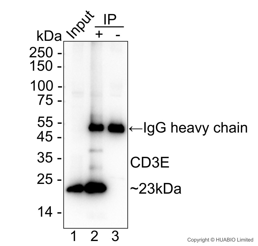 CD3 was immunoprecipitated from 0.2 mg MOLT-4 cell lysate with HA724302 at 2 µg/10 µl beads. Western blot was performed from the immunoprecipitate using HA724302 at 1/10,000 dilution. Alpaca anti-Rabbit IgG Fc secondary antibody (HA1031) at 1/50,000 dilution was used for 1 hour at room temperature.