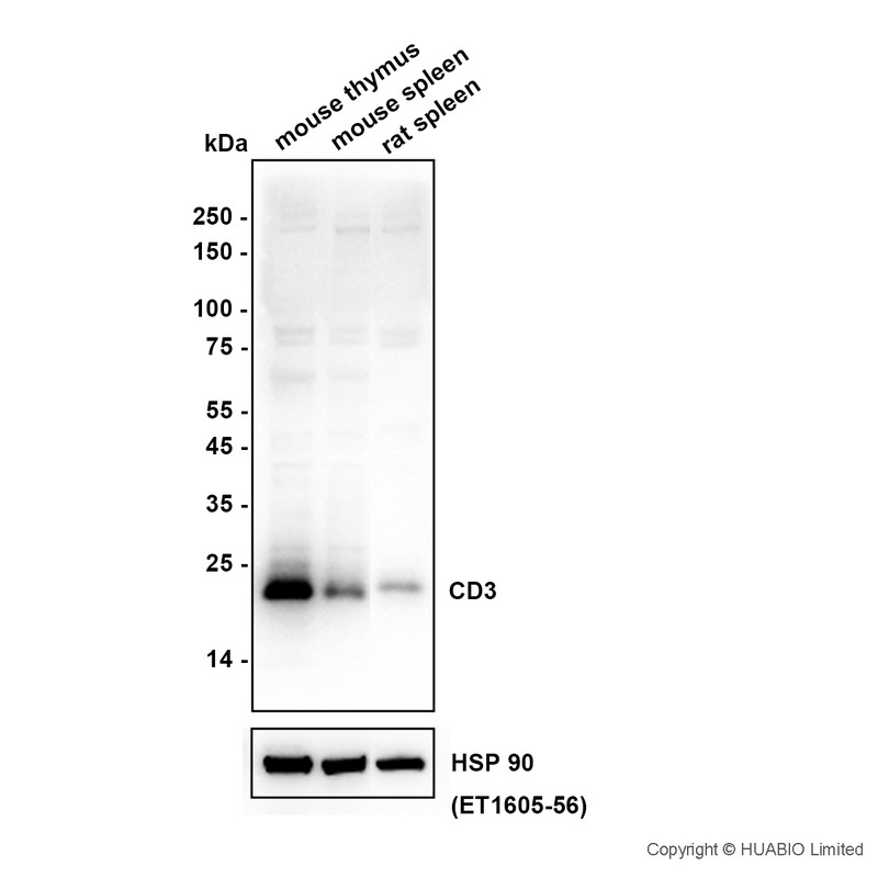 Western blot analysis of CD3 on different lysates with Rabbit anti-CD3 antibody (HA724302) at 1/20,000 dilution.