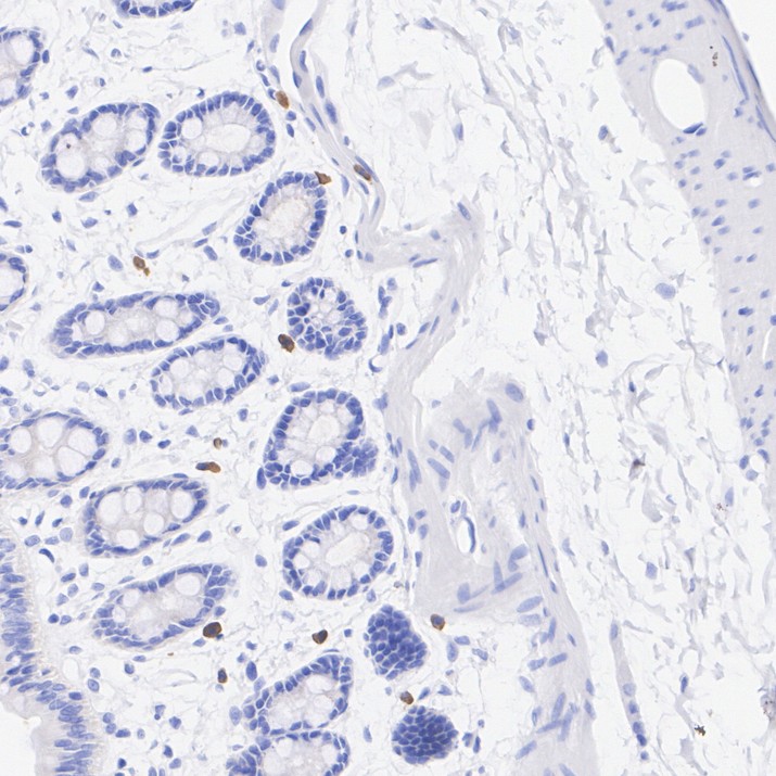 Immunohistochemical analysis of paraffin-embedded rat colon tissue with Rabbit anti-CD3 antibody (HA724302) at 1/5,000 dilution.