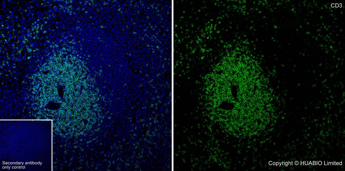 Cells were fixed in 4% paraformaldehyde for 15 minutes at room temperature, permeabilized with 0.1% Triton X-100 in PBS for 15 minutes at room temperature, then blocked with 1% BSA in 10% negative goat serum for 1 hour at room temperature. Cells were then incubated with Rabbit anti-CD3 antibody (HA724302) at 1/500 dilution in 1% BSA in PBST overnight at 4 ℃. Goat Anti-Rabbit IgG H&L (iFluor™ 488, HA1121) was used as the secondary antibody at 1/1,000 dilution. PBS instead of the primary antibody was used as the secondary antibody only control. Nuclear DNA was labelled in blue with DAPI.