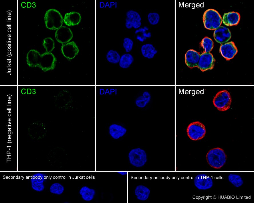 Immunocytochemistry analysis of Jurkat (positive) and THP-1 (negative) labeling CD3 with Rabbit anti-CD3 antibody (HA724302) at 1/500 dilution.